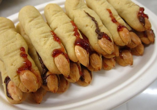 Una volta raffreddate, sicuramente noterete che qualche mandorla si staccherà dalla sommità dei biscotti: per fissarle più saldamente, intingete la parte della mandorla che poggiava sul biscotto nella marmellata e quindi riposizionatela nel posto originario. Lasciate asciugare e le dita della strega saranno pronte per essere gustate!