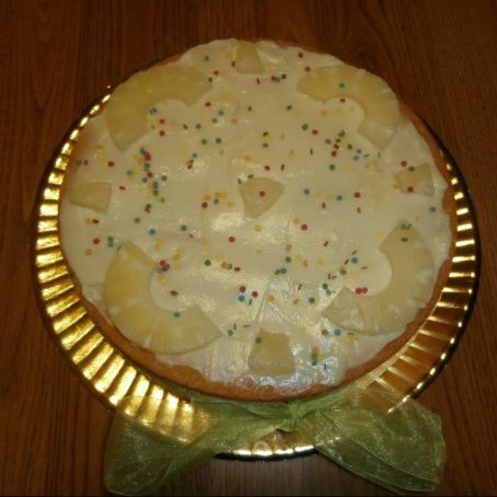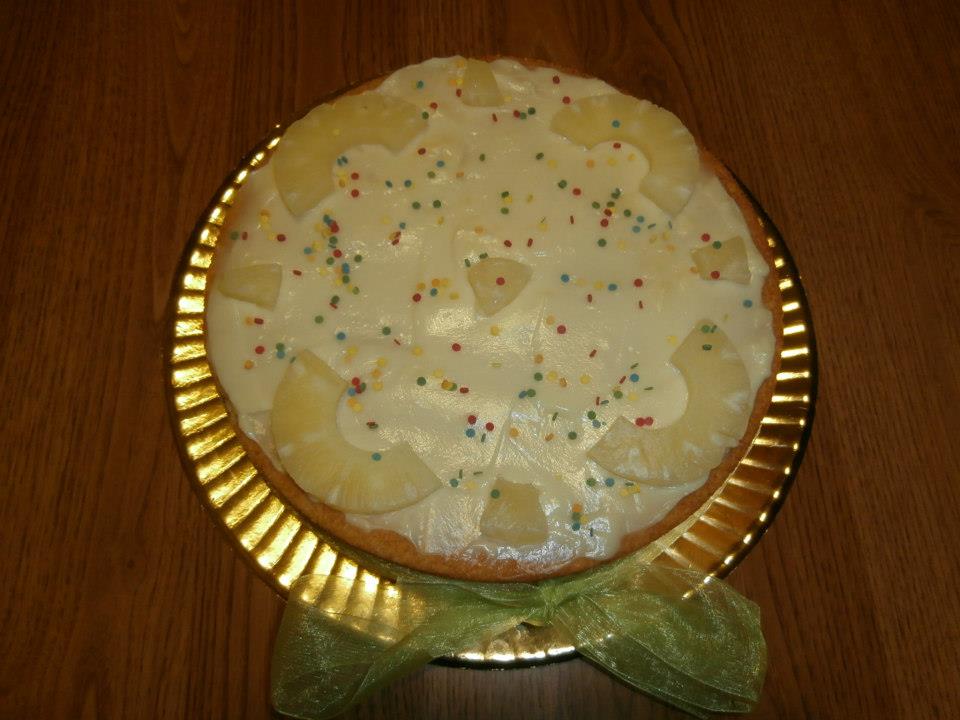 Posare uno strato di pan di spagna sul vassoio, bagnarlo con il succo dell'ananas, versare un po' di crema e mettere l'ananas a pezzetti.