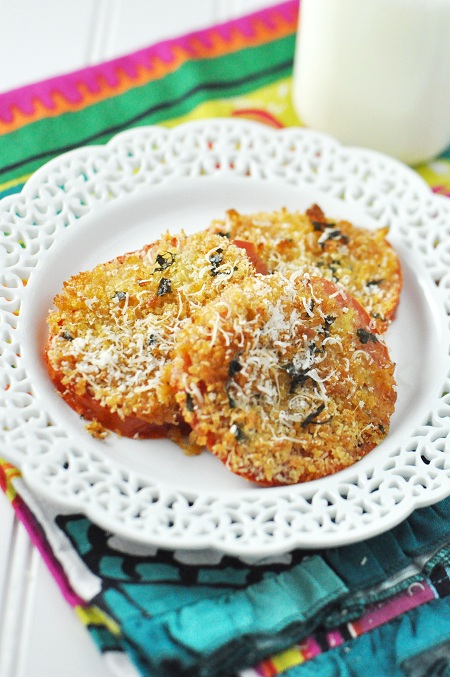 3. Disporre i pomodori su una teglia (rivestita con carta da forno). Spalmare l'aglio esporare la miscela di fomaggio e pane, aggiungere sale, pepe e prezzemolo. Condire con olio e cuocere fino a quando i pomodori sarano teneri, circa 10 minuti.
