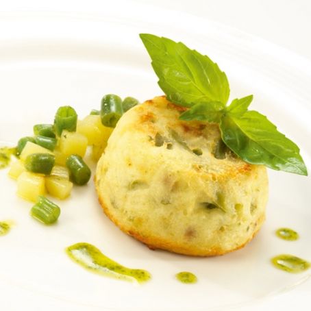 Uniamo le uova, il parmigiano ed il burro fuso e la noce moscata. Mescoliamo bene e regoliamo di sale. Uniamoci anche i fagiolini cotti e spezzettati passati col passa verdure. Amalgamiamo il tutto e regoliamo di sale.