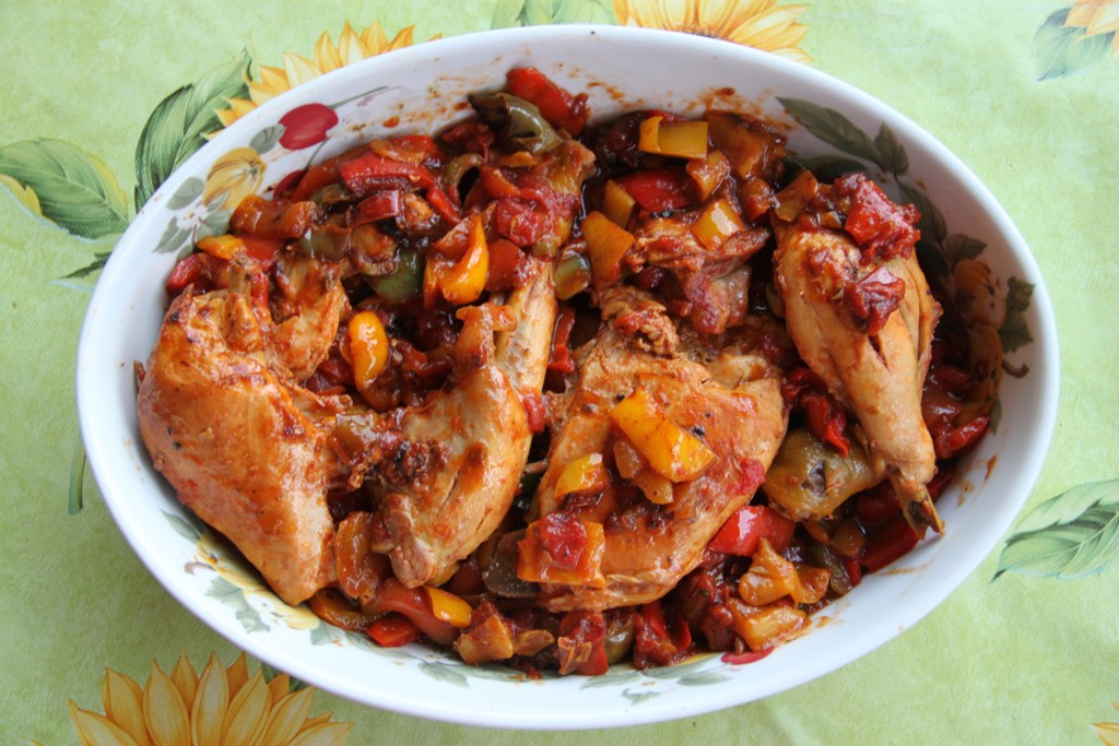 Quando il pollo sarà ben rosolato, sfumatelo con un bicchiere di vino bianco e lasciatelo evaporare a fuoco vivace. Una volta evaporato il vino, abbassate la fiamma ed unite i peperoni alla casseruola. Salate la preparazione e aromatizzate con qualche foglia di basiico. Coprite la casseruola e lasciate cuocere il pollo per circa un'ora prestando attenzione a che non s'asciughi troppo, nel caso aggiungete poca acqua calda. Servite il pollo ancora ben caldo accompagnato dal sughetto di peperoni.