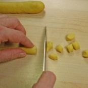 Dividere l'impasto in piccole parti e fare dei salsicciotti(come per gli gnocchi). Tagliare a tocchetti non troppo grandi.