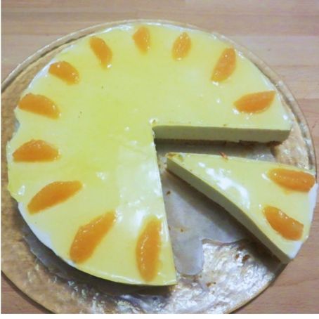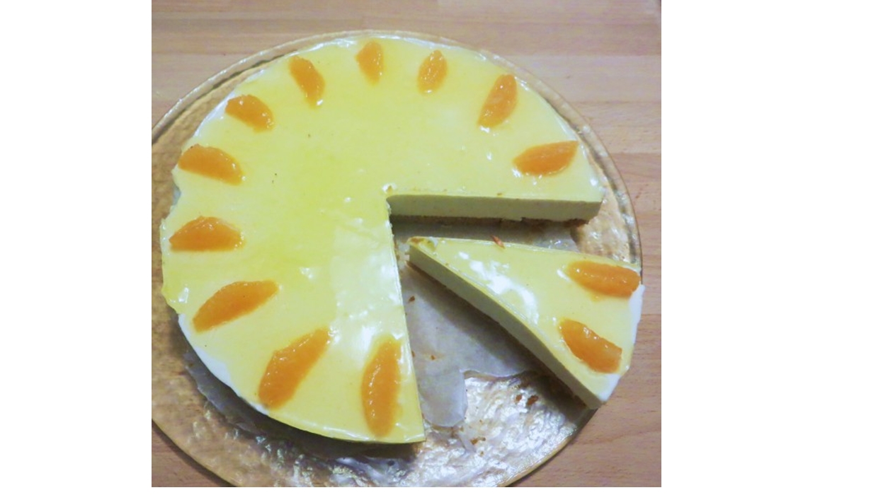 Disporre sopra la bavarese gli spicchi di mandarino a raggiera e velare con la gelatina di arancia ormai a temperatura ambiente prima che inizi a rapprendersi.