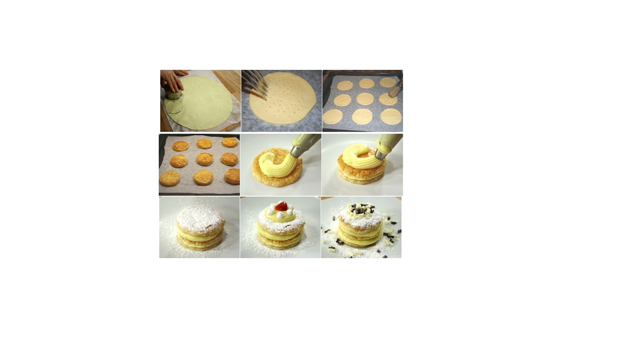 A cottura avvenuta, sfornate le sagome di pasta sfoglia e lasciatele raffreddare, poi con un coltello affilato dividetele a metà (tagliandole come per aprire un panino) stando attenti a non romperle; vi troverete ad avere 18 dischetti, con i quali otterrete 6 piccole millefoglie (per realizzare 1 millefoglie occorrono tre dischi).