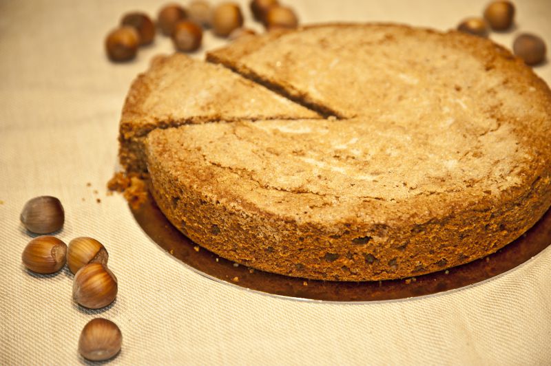 Far sciogliere il burro (200 gr) e unirlo alle uova (4). Sbattere bene e aggiungere gli amaretti secchi (1 hg), le nocciole (1/2 kg), lo zucchero (1,5 hg) e 1/2 pacchetto di cacao amaro. Amalgamare bene, mettere un bicchierino di grappa. Cuocere in forno a 180° per 40 minuti.