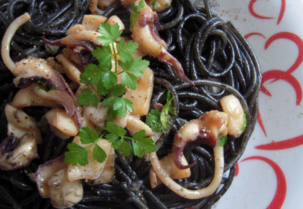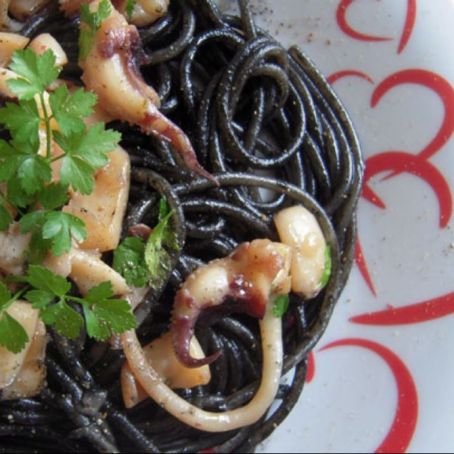 Servite gli spaghetti al nero di seppia nei piatti da portata aggiungendo le seppie tenute da parte, al caldo.