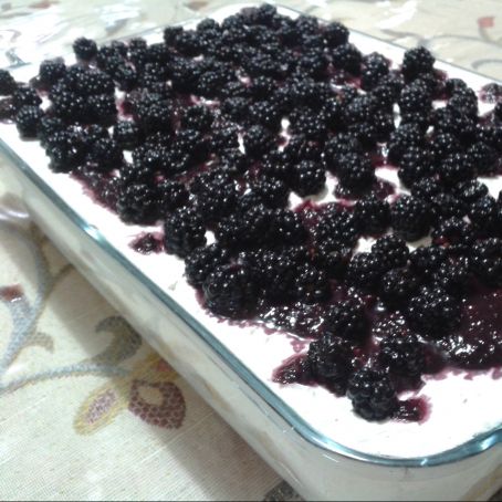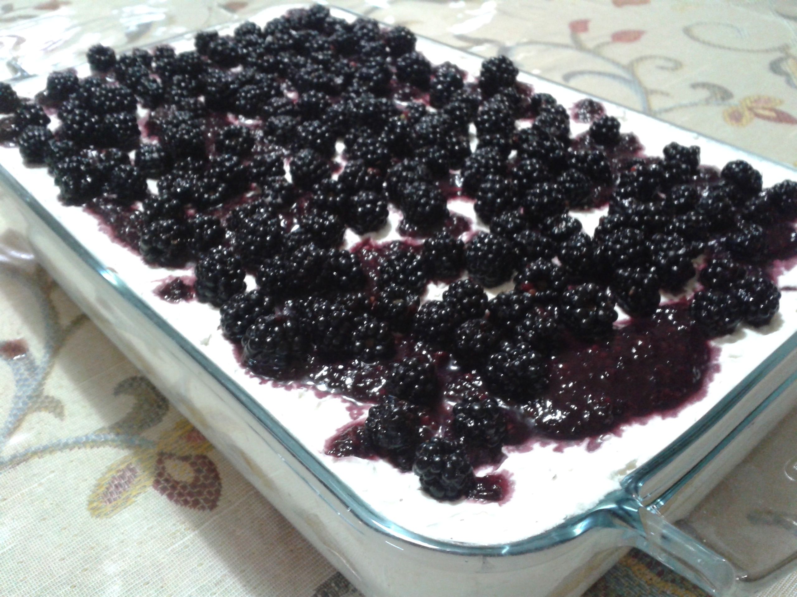 Versare un po’ di marmellata sul fondo della pirofila, intingere i savoiardi nella bagna da entrambe i lati con un movimento abbastanza veloce e disporre il primo strato. Versare sui savoiardi uno strato di crema e livellarla il più possibile. Disporre ora ulteriore marmellata e ricoprire nuovamente con i savoiardi bagnati al cocco, quindi un secondo strato di crema. Infine ricoprire il tiramisù con la marmellata avanzata e le more rimaste. Ricoprire con gelatina alimentare (preparata secondo le istruzioni riportate sulla confezione) per evitare che la frutta fresca in superficie si rovini.