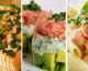 Tagliare dei rettangoli di salmone affumicato, spalmarli con la crema di caprino e cipollina e arrotolare.