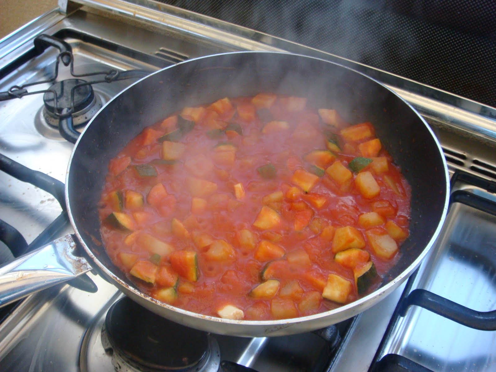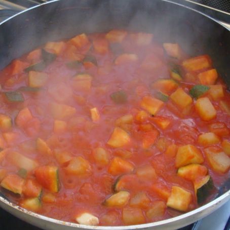 Rosolare in olio e burro gli zucchini tagliati a tocchetti e la cipolla a fettine sottilissime. Dopo 5 minuti unire un po di vino bianco secco, 1/2 kg di pomodori tritati, un ciuffo di prezzemolo, basilico e rosmarino tritati. Aggiungere uno spicchio di aglio intero e un dado. Abbassare la fiamma, mettere il coperchio e cuocere per circa 20 minuti.