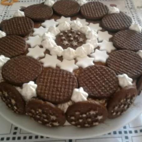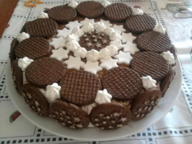 Continuate in questo modo creando almeno 4 strati di biscotti; terminate la torta cospargendo la superficie con del cacao amaro o terminate semplicemente con uno strato di biscotti, la torta pan di stelle è pronta lasciatela riposare in frigo per almeno 2 ore prima di consumarla.