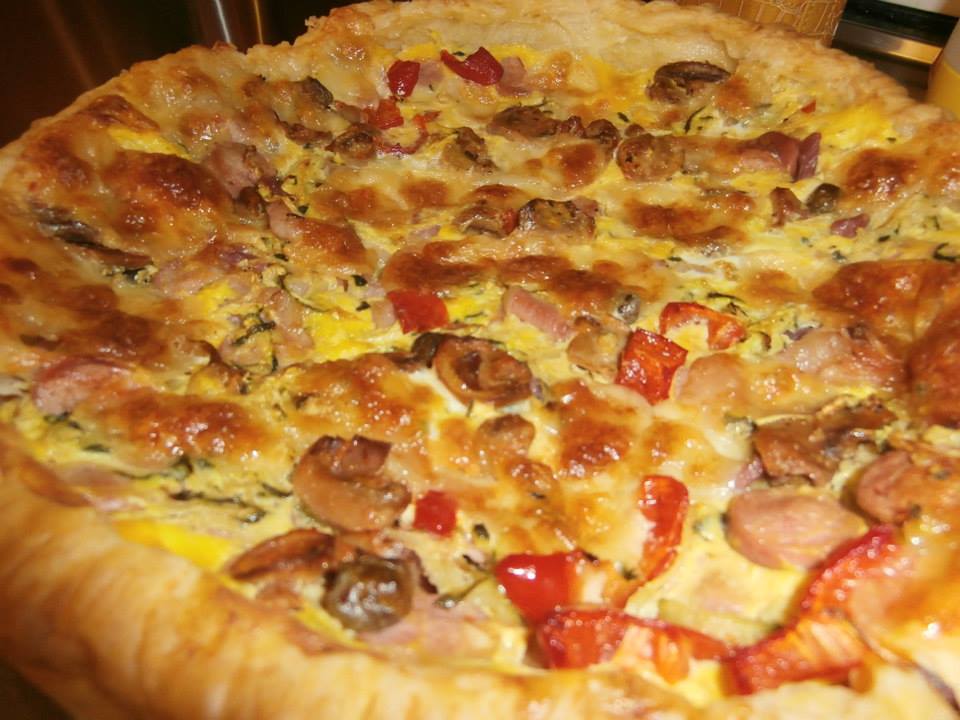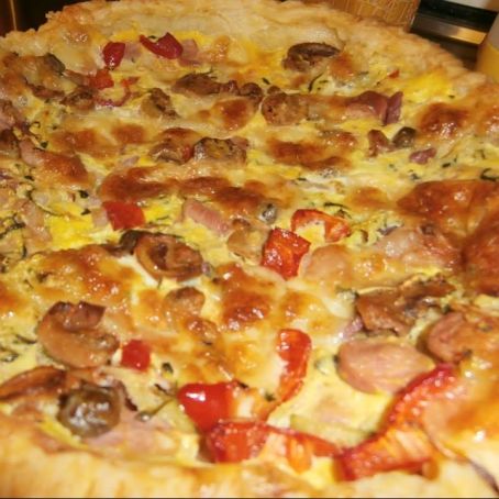 Stendere la sfoglia con ancora la sua carta forno direttamente nella teglia, bucherellarla, versare tutti gli ingredienti , per ultimo l'uovo sbattuto e cuocere in forno caldo a 180°C.