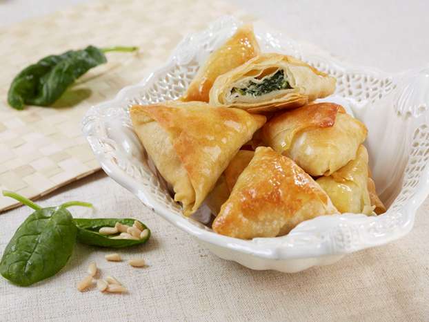 Stendere l’impasto con un mattarello in una sfoglia rettangolare e dividerla in 10 quadrati. Spennellare i quadrati con l’uovo leggermente sbattuto, distribuirvi il ripieno agli spinaci e piegarli a triangolo. Premerne i bordi con i rebbi di una forchetta per chiuderli bene.