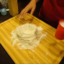 Lavorare l’impasto sul piano del tavolo infarinato per almeno 10 minuti, allargandolo con i pugni chiusi, riavvolgendolo e sbattendolo sul tavolo, fino al completo assorbimento del liquido.