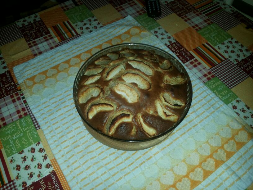 Versare metà del composto nella teglia, sistemare le fette di mela a raggi e aggiungere l'altra metà dell'impasto.
