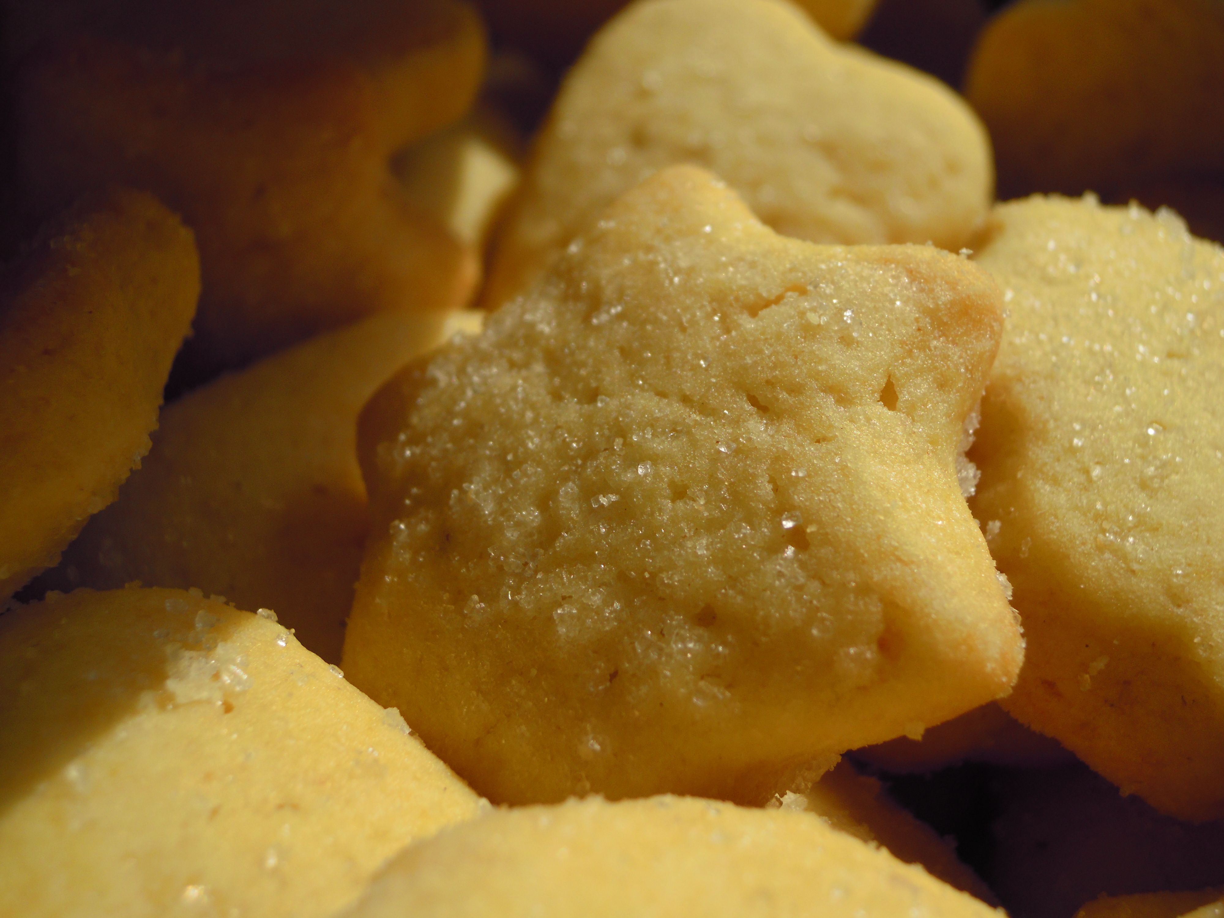 In una terrina sbattete il burro insieme allo zucchero, preferibilmente con una frusta elettrica, così eviterete fastidiosi grumi. Quando il composto sarà uniforme unite le bustine di vanillina e le uova e continuate a sbattere fino a che il tutto non è incorporato per bene e non otterrete una bella crema. A questo punto, poco alla volta, unite la farina e il lievito setacciati e mescolate, prima con il cucchiaio successivamente con le mani, fin quando otterrete una palla d’impasto. Quello che otterrete sarà un qualcosa di morbido e anche di un pochino appiccicoso, non ha la consistenza della classica frolla, però quando andrete a stendere la pasta per ricavarne i biscotti basterà spolverare di farina il piano di lavoro e il matterello e vedrete che non ci saranno problemi. A questo punto, una volta stesa la pasta, coppate i biscotti delle forme che più vi piacciono, io però consiglio non troppo grandi, la dimensione dei classici Danesi è perfetta, e poi non troppo spessi, poco meno di 1 cm va bene, perché poi può succedere che non si cuociano del tutto o che rimangano troppo morbid. Dategli una spolverata di zucchero (non è necessario, però è quel tocco in più che li rende ancora più buoni), mettete la teglia in forno e cuocete per 15 minuti a 170° a forno statico!