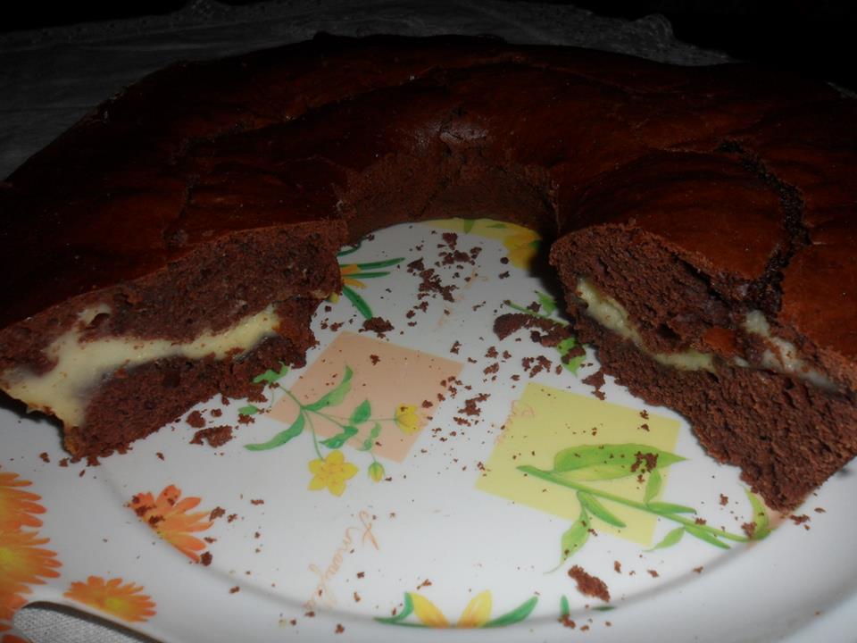 Imburrare ed infarinare uno stampo da ciambella (22cm di diametro circa) e versarvi una parte dell'impasto. A questo punto versare la crema precedentemente preparata e ricoprire con la restante parte dell'impasto.