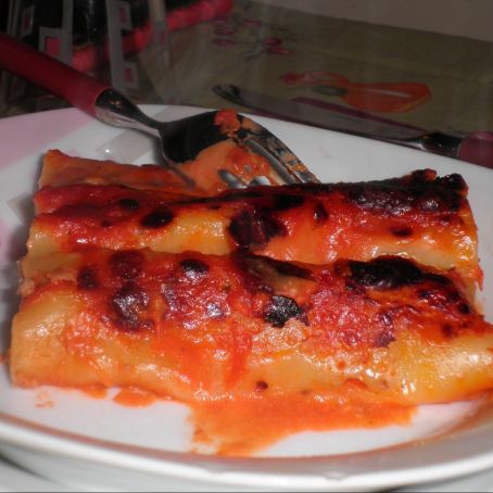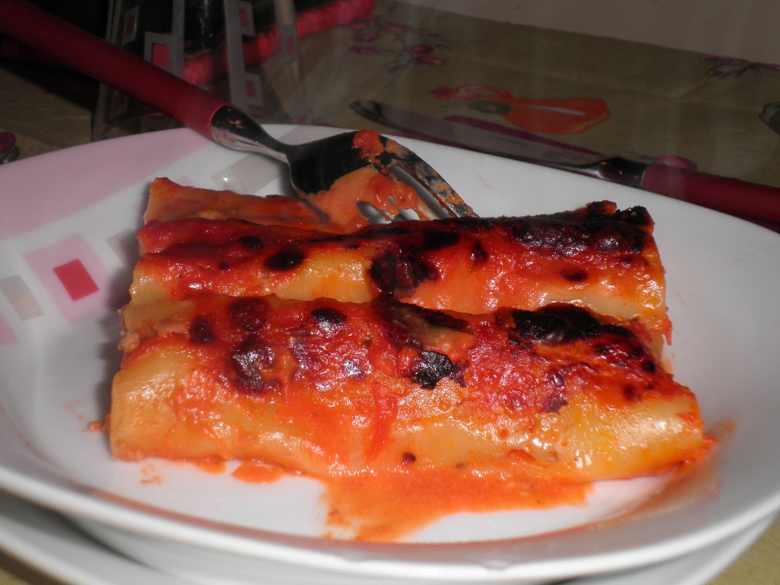 ricopriteli con uno strato della restante besciamella e con un altro della restante salsa di pomodoro. Cospargete la superficie con i cubetti di melanzane e spolverizzate con la ricotta salata. Infornate i cannelloni in forno già caldo a 180° per circa 45 -50 minuti. Una volta cotti estraete dal forno i cannelloni e lasciateli riposare 15 minuti prima di servirli.