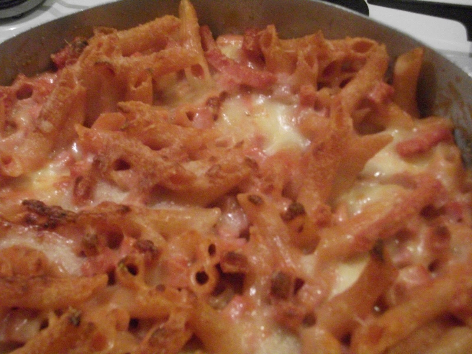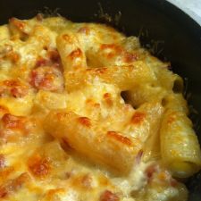 Una volta che il sugo e la pasta sono pronti li metto insieme in una teglia aggiungendo la mozzarella e il salame che avrò tagliato in precedenza a cubetti .