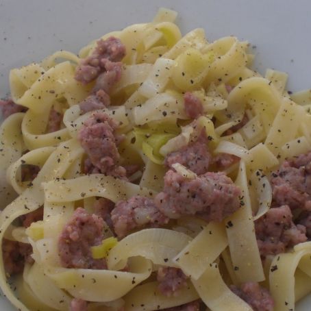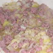Facciamo appassire le rondelle di porro nell' olio e intanto facciamo a pezzetti piccoli la salsiccia aiutandoci con una forchetta.