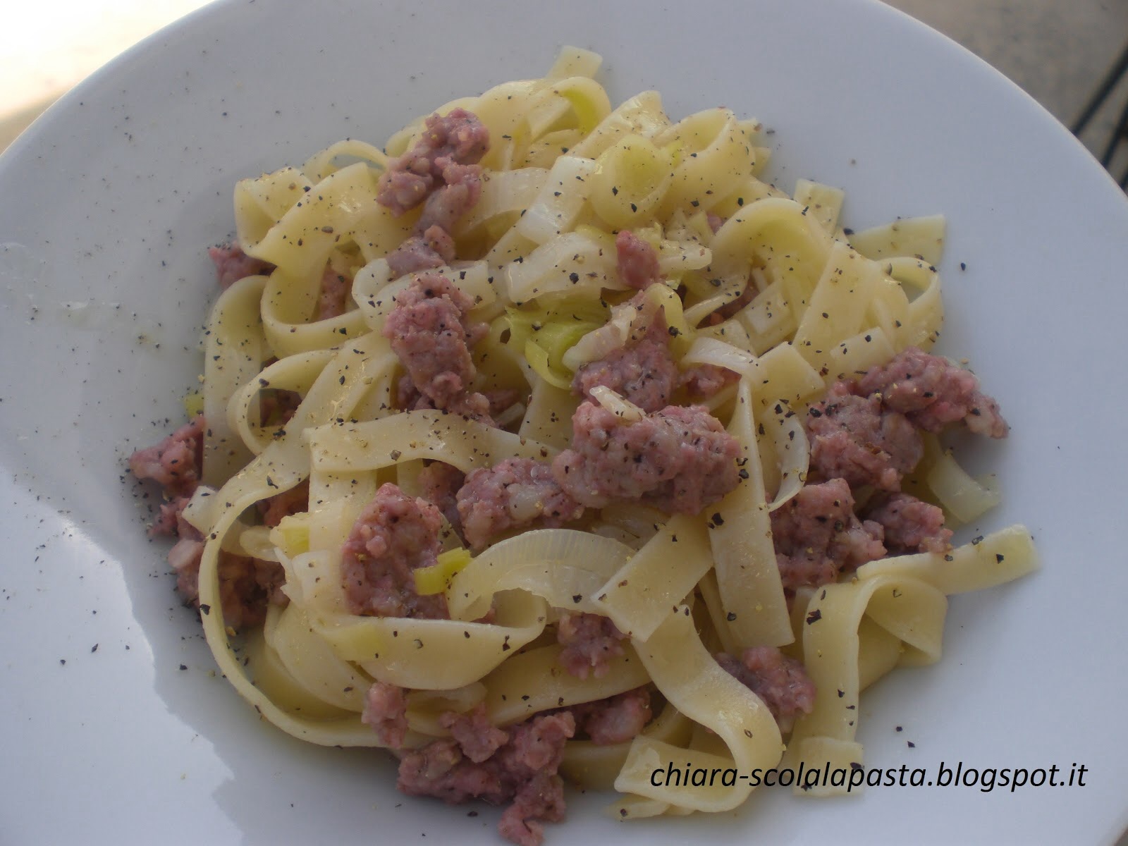 Uniamo così la salsiccia ai porri, aggiungiamo sale e pepe e una volta preso colore aggiungiamo il vino bianco.