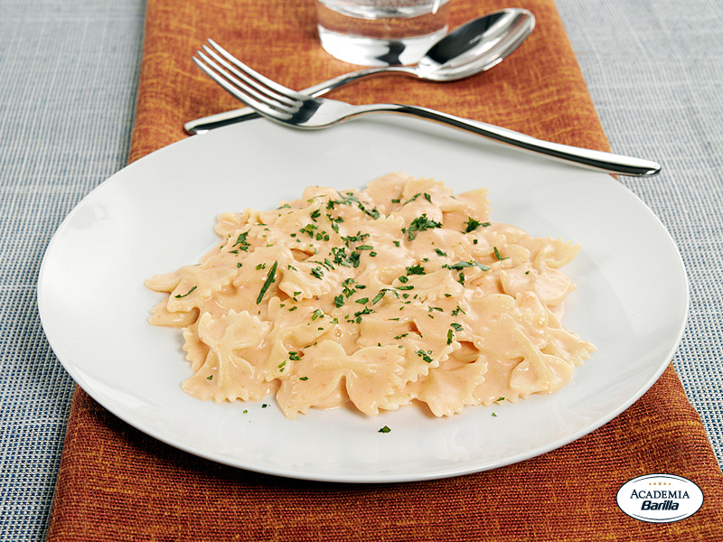 Cuocere le Farfalle Barilla in abbondante acqua salata, scolare e mantecare con la salsa. Prima di servirle spolverare con Parmigiano Reggiano e prezzemolo.
