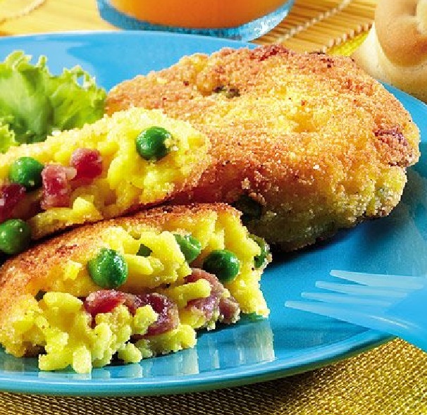 Tagliate il prosciutto o la carne a dadini e aggiungeteli al risotto freddo e ai piselli scongelati. Mescolate bene.