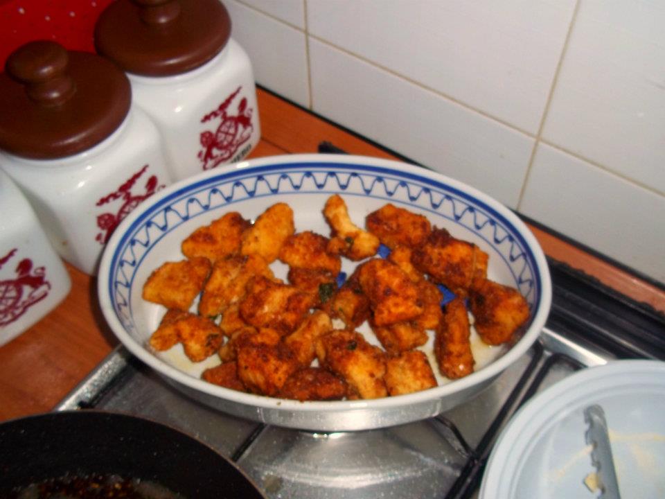 - Ora immergete delicatamente i pezzi di pollo nell'olio e fateli dorare su entrambi i lati girandoli spesso nei primi 3/4 minuti di cottura.