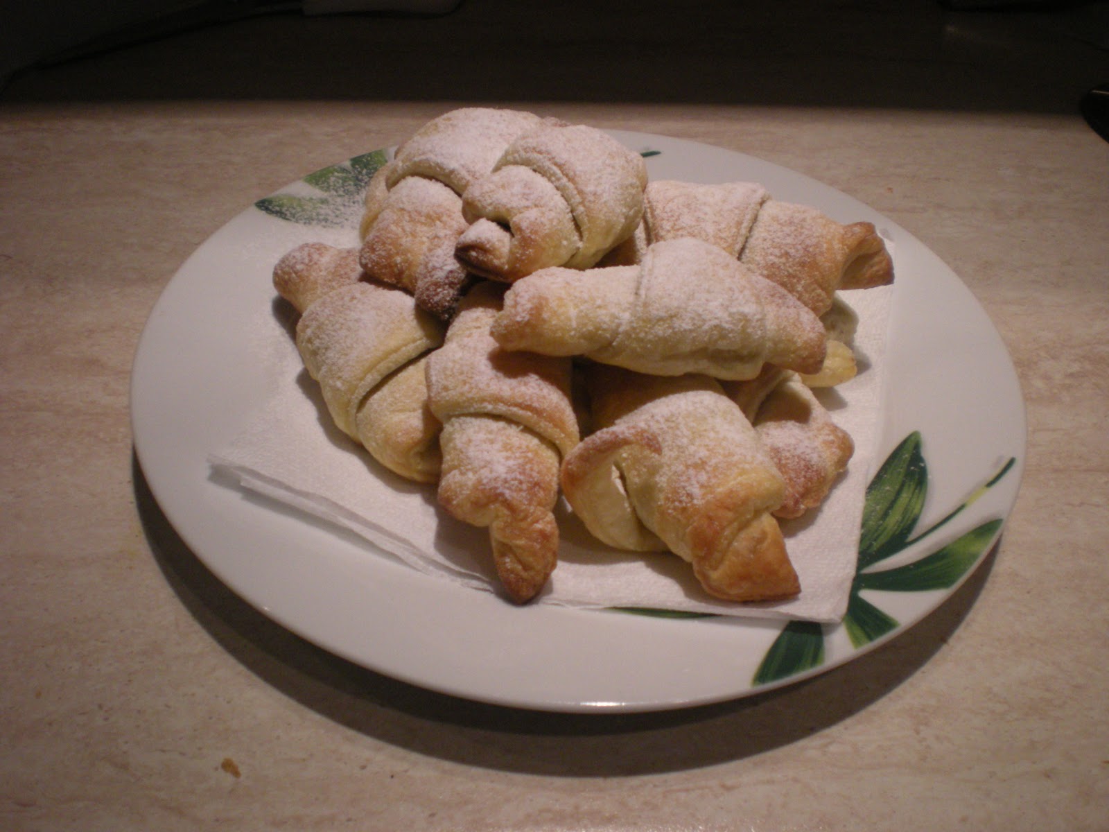 Mettere su ogni spicchio un cucchiaio colmo (o stra-colmo) di Nutella ed arrotolare i triangoli di pasta partendo dal loro lato corto (la parte più esterna della pasta sfoglia), procedendo verso la punta.