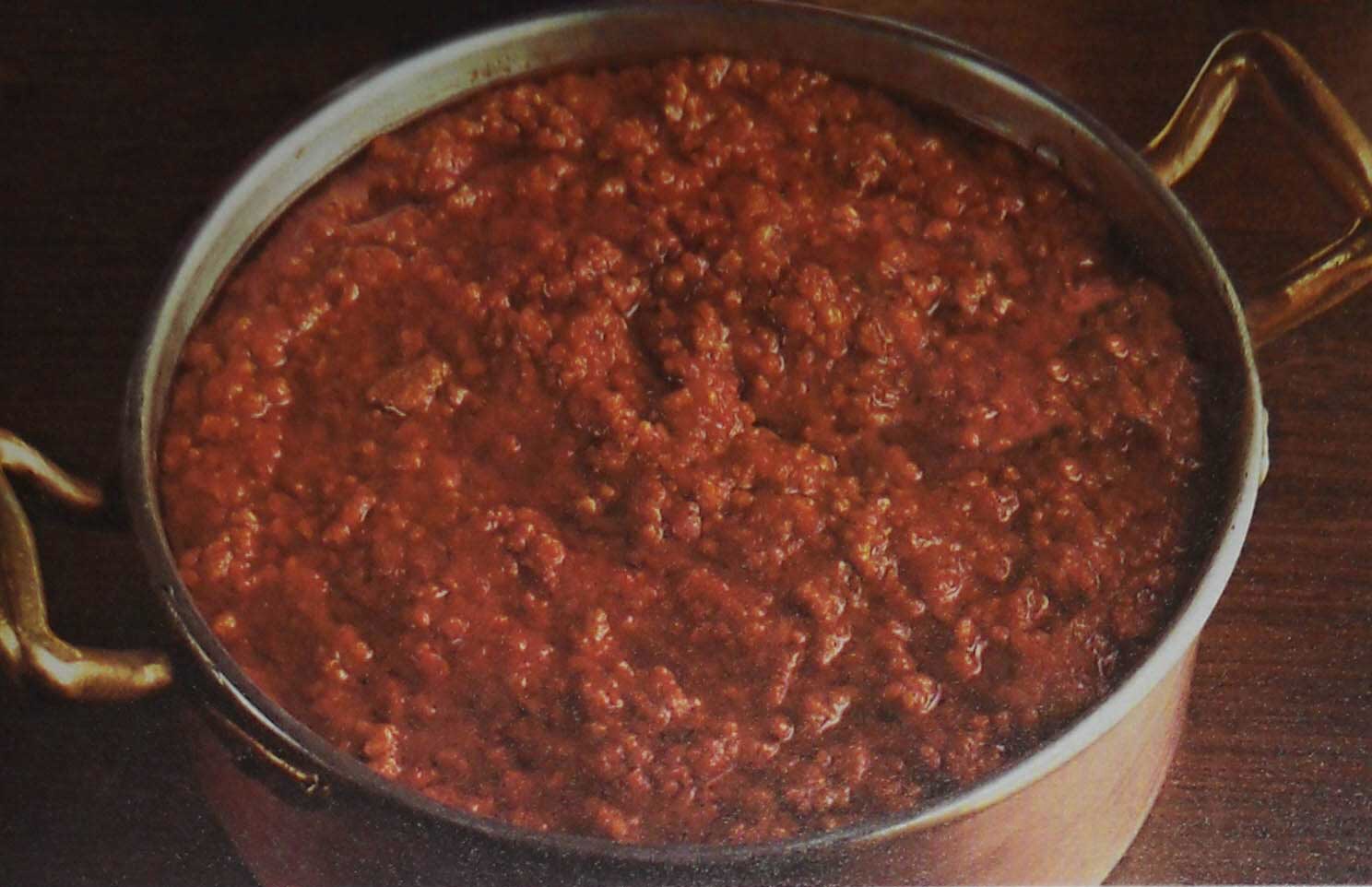 In un tegame versare l'olio e le verdure tritate, farle soffriggere, aggiungere la carne tritata, una grattugiata di noce moscata e far rosolare a fuoco lento. In seguito aggiungere il vino, farlo evaporare per qualche minuto e unire i pomodori pelati passati al passaverdure. Infine salare e far cuocere il ragù di carne a fuoco moderato per circa 25/30 minuti.