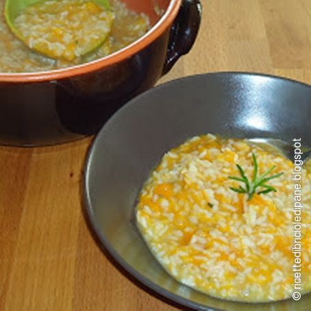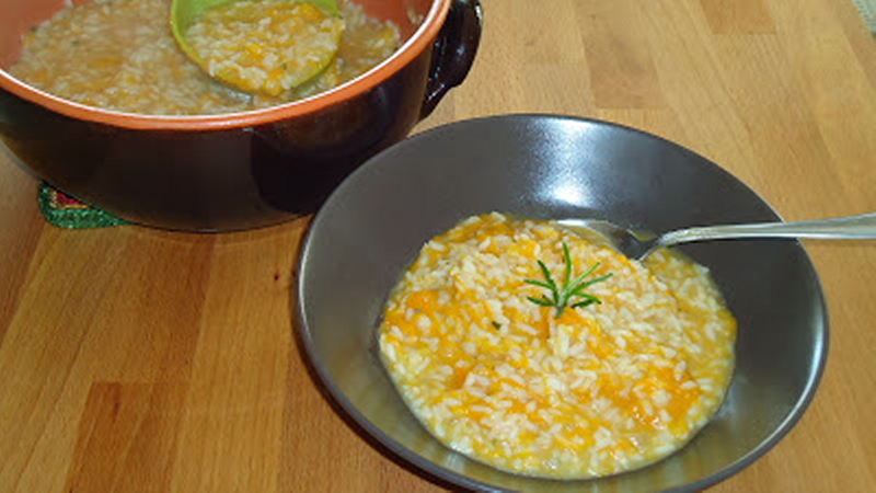 La zucca deve cuocere per circa 10 minuti a fiamma media e senza aggiungere acqua perché la zucca,cuocendo,ne rilascia molta. Una volta ammorbiditi, aggiungete il riso e mescolate il tutto qualche minuto affinchè il riso non si attacchi al tegame e lasciate cuocere per almeno altri 15 minuti aggiungendo il vino e, lentamente anche il brodo caldo (acqua+preparato per brodo).