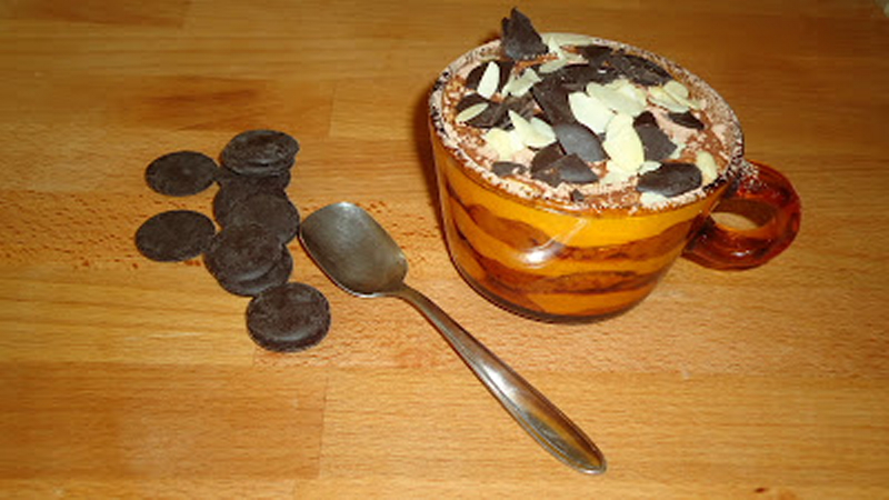 Sbriciolate poi i biscotti e metteteli sul fondo dei bicchieri. Bagnateli leggermente con il caffè,coprite con la crema al mascarpone e cospargete con il cioccolato a fatto a pezzetti e le lamelle di mandorle