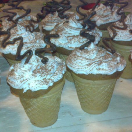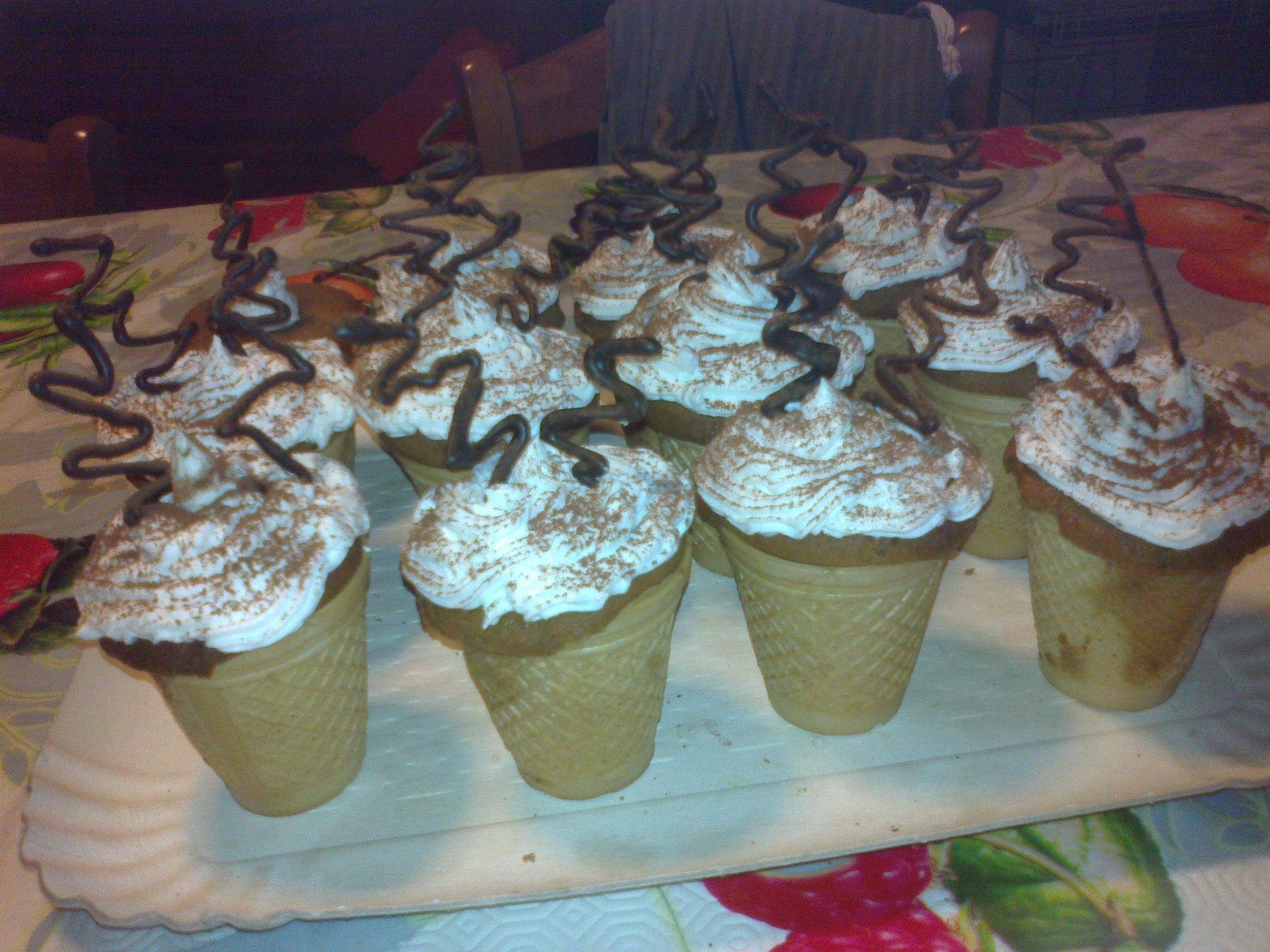 In una terrina mescolare la farina allo zucchero e al lievito. A parte sbattere le uova con il latte ed il burro fuso. Unire i composti e mescolare. Aggiungere all'impasto un cucchiaio abbondante di nutella e mescolare. Versare l'impasto nei cestini in cialda per gelato e riempirli poco più della metà ed infornare a 180 gradi per 25-30 minuti. Lasciar raffreddare e decorare con panna montata, spolverizzare con cacao e rifinire la decorazione.