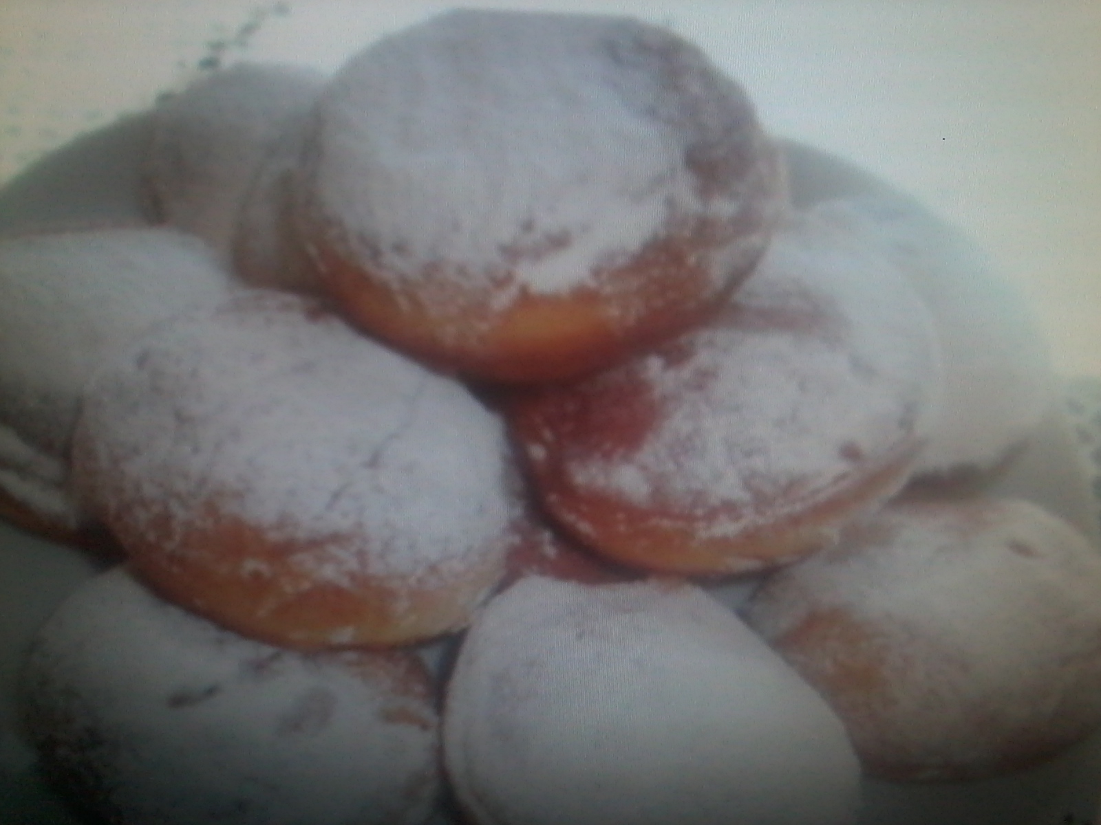Prendiamo un vaso metiamo dentro il lievito ,un cucchiaio di zucchero.un po di latte,tuto si mescola i se lasa al caldo a lievittare per 40 min.Prendiamo ul altro vaso metiamo dentro la farina ,in mezo si fa un buco i si mete la compozitione che a ripozato 40 min,zucchero,le uova gia sbatutte,zucchero al vaniglia,burro,tuto si lavora bene poi si da al caldo per 1 ora.Dopo si stende sopra la tavola i con un bicchere si fano de li cercchi,si lasano ancora al riposo per 15 min,poi si metono in olio per frigersi,dopo che li avete rozolato pene si metono su un piato i se scomparge zucchero al velo