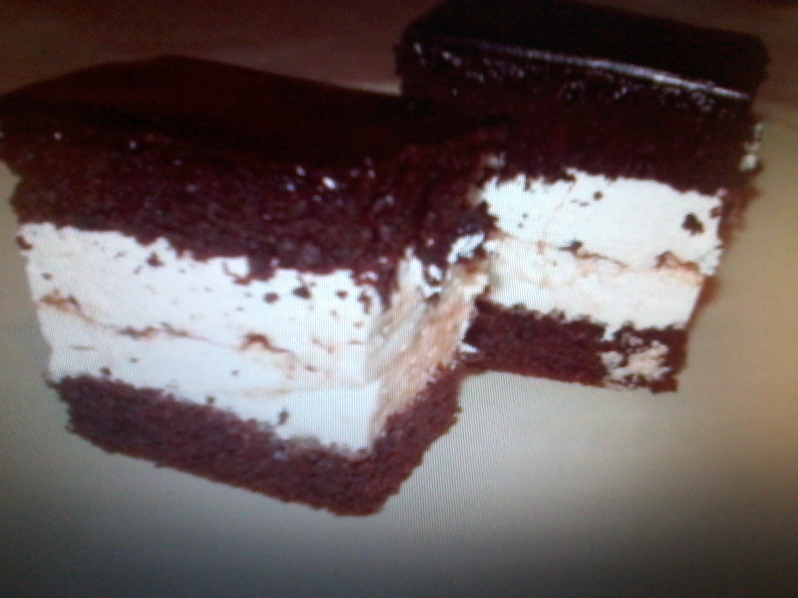 - pandispania:4 cucchiai di zucchero ,4 uova,3 latte,4 olio,3 semolion,3 cacao,2 farina,2 miele,una bustina lievitto.Crema:300 panna per dolci,3 cucchiai latte.10 gr gelatina, vaniglia.Glassa1:60 ciocolata nera,35 gr burro.un cucchiaio olio,1 di aqua.Glassa2:150 gr ciocolato,75 burro,75 panna .