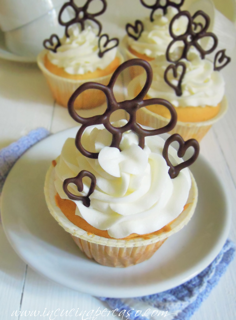 Per i fiorellini ho sciolto del cioccolato fondente in microonde e ho “disegnato” i fiorellini con un conetto di carta forno, li ho lasciati asciugare in frigo per mezz’oretta e infine li ho messi sui muffin alla vaniglia con frosting al limoncello come decorazione!