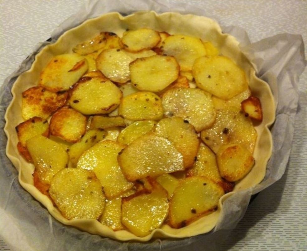 Coprite con l’altro rotolo di pasta sfoglia facendo aderire i bordi tra di loro. Spennellare la superficie della torta salate patate e speck con un uovo battuto.