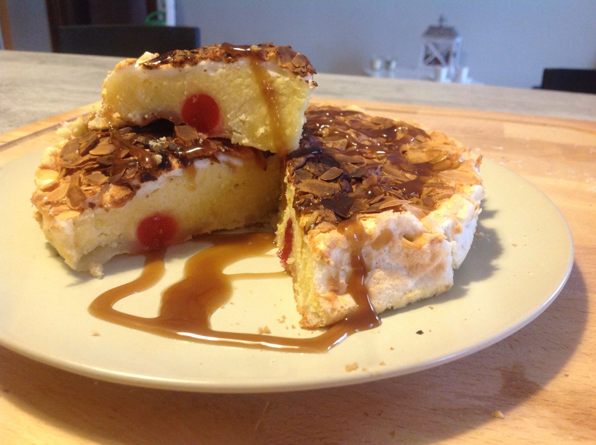 Una nuvola di meringa, sovrasta un soffice pan di spagna..il tutto ingolosito da sciroppo alla nocciola e ciliegine candite