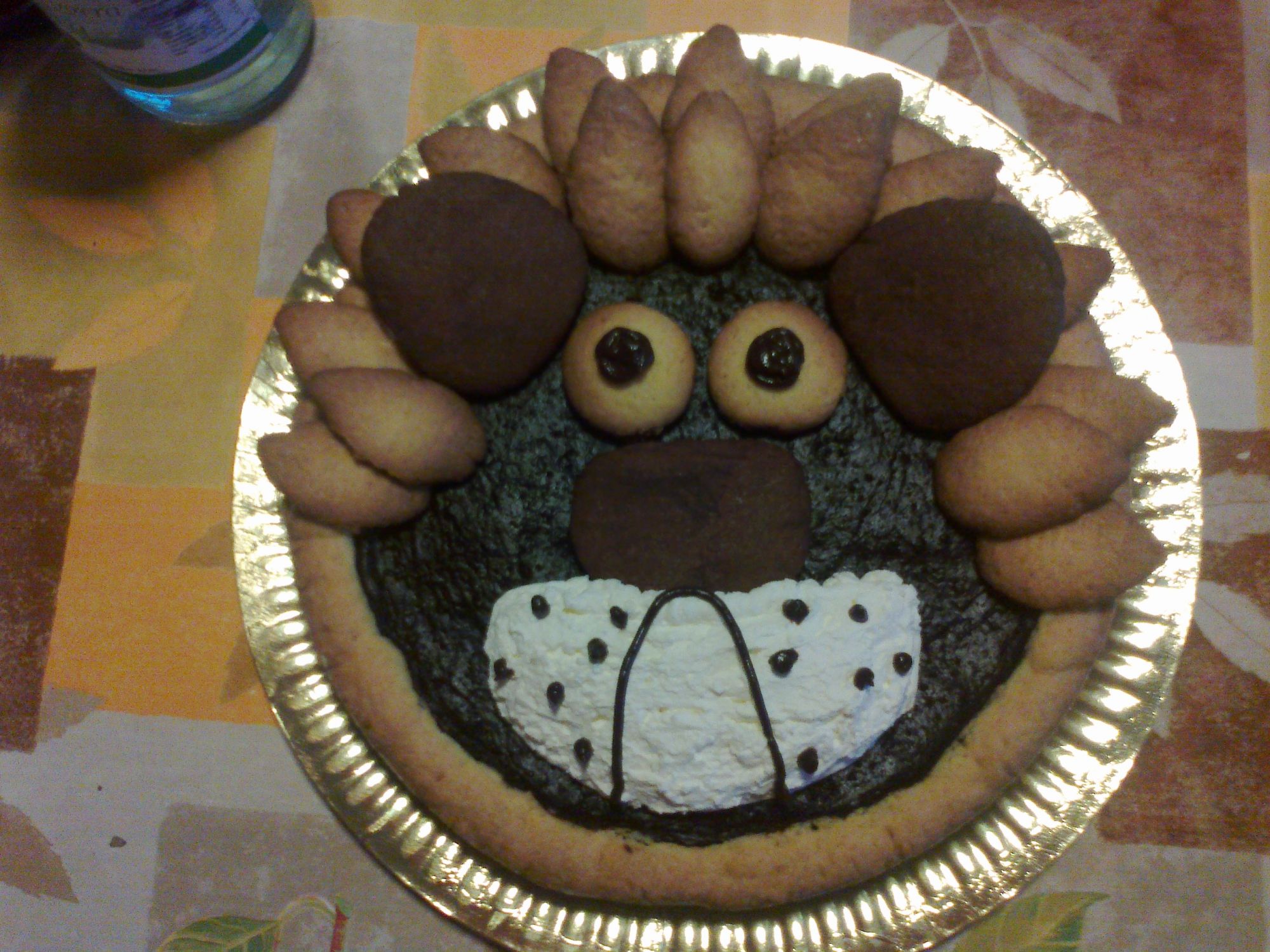 Preparare l'impasto: in una terrina mescolare la farina con zucchero, sale, uova, burro a pezzetti e per ultimo il lievito e lavorare bene con le mani (se risulta appiccicoso far riposare in frigo 30 minuti). Stendere i 2/3 dell'impasto in una tortiera (diametro di 24 cm) anche sulle pareti. Preparare la crema al cioccolato e distribuirla sull'impasto tenendone da parte 1 cucchiaio per la decorazione. Cuocere 180 gradi per 35-40 minuti. Con l'impasto rimasto far 4 rotolini lunghi 30 cm e tagliare ognuno in 10 pezzi. Assottigliare leggermente 31 pezzetti ad una estremità (a mo' di goccia) per formare la criniera del leone. Unire altri 3 pezzi e formare 2 palline per gli occhi. Alla pasta rimanente aggiungere il cacao e formare il naso e le orecchie. Disporre tutti i pezzi leggermente distanziati tra loro sulla piastra rivestita con carta forno e cuocere a 180 gradi per 8-10 minuti. Montare la panna con lo zucchero e con essa attaccare i biscotti alla torta formando la criniera e le orecchie del leone. Con la panna rimasta formare il muso leggermente bombato ed infine attaccare gli occhi ed il naso. Con la siringa disegnare con la crema al cioccolato la bocca, le pupille ed i puntini del muso.