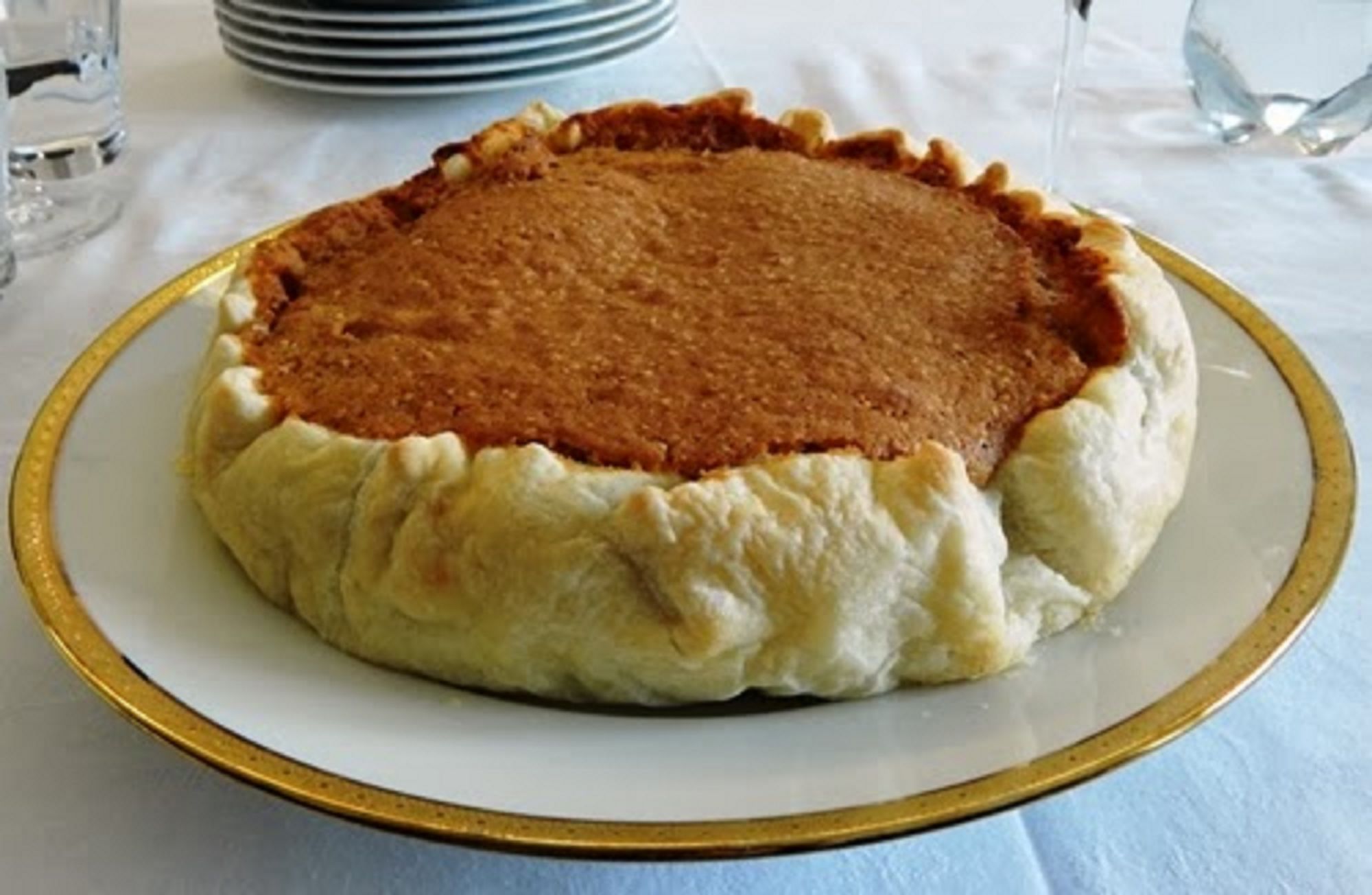 Lavorare le uova con lo zucchero, aggiungere la farina, il lievito, il sale, il burro fuso, gli amaretti sbriciolati e le mandorle tritate finemente.Amalgamare bene. Foderare uno stampo a cerniera con la pasta sfoglia, versare all'interno il composto d infornare a 180 gradi per 45 minuti circa. Una volta raffreddata sformare e spolverizzare la superficie con lo zucchero a velo.