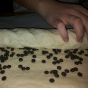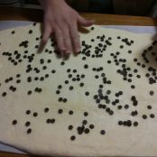 Riprendete l'impasto, rimpastatelo appena, stendetelo a forma di rettangolo e cospargetelo con le gocce di cioccolato.