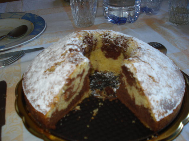 Lavorare le uova con lo zucchero.Setacciare la farina e aggiungerla; aggiungere pure il lievito, la vanillina, la margarina, un pizzico di sale e il latte. Mescolare il tutto e dividere l'impasto in due parti uguali e in uno mettere il cacao e mescolare.Imburrare una teglia e metterci un cucchiaio di impasto bianco e uno nero alternando fino a completare.Mettere in forno e cuocere a 180° per 30 minuti!
