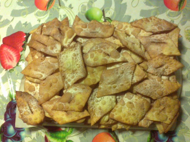 In una ciotola capiente mettere la farina ed al centro versare le uova, lo zucchero, la buccia di limone grattugiata, sale, burro fuso, limoncello ed anice. Aggiungere un po' per volta il vino bianco ed impastare formando una palla. Porre a riposare per almeno 30 minuti coperta con un canovaccio. Con l'aiuto della macchina per la pasta, tirare l'impasto con spessore posizionato sulla tacca 4, 5 e 6 (ne usciranno in sorte in base ai gusti delle persone). Tagliare ora le sfoglie ottenute a rombi con una rotella dentellata praticando un taglietto anche al centro. Friggere in abbondante olio d'arachidi bollente per pochi minuti tenendo girate le chiacchiere e quando cominciano a dorare, scolare su di un panno assorbente. Sistemare su di un vassoio da portata rivestito con dei tovaglioli di carta e spolverizzare con lo zucchero a velo.