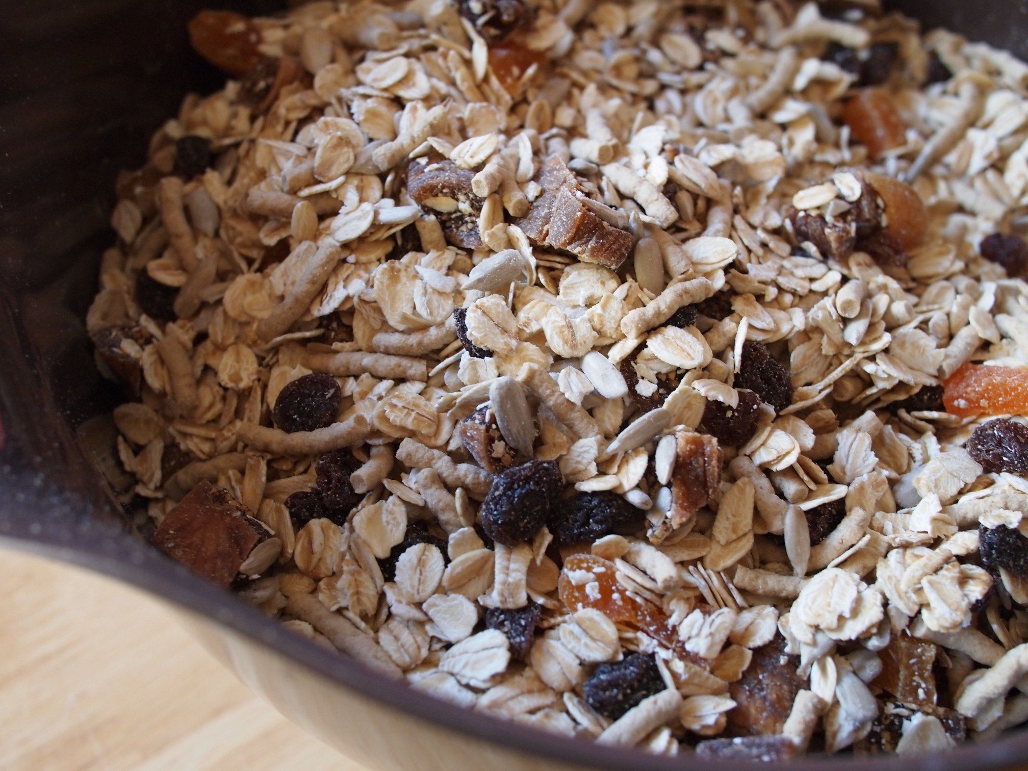 Mescolare insieme il muesli con la panna, aggiungere un uovo e man mano tutti gli ingredienti. Fino a formare un impasto omogeneo.