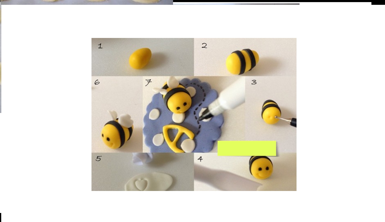 Partite da un cilindro piccolo di pasta gialla, allungatelo all’estremità e applicate due piccole strisce nere (foto 1-2); con il ball tool ricavate le cavità degli occhi (foto 3) e, con il serrated tool la bocca (foto 4). Per le ali usate uno stampino ad espulsione a forma di cuore (foto 5-6). Applicate sulla base insieme alla lettera A e rifinite con il pennarello alimentare nero (foto 7).