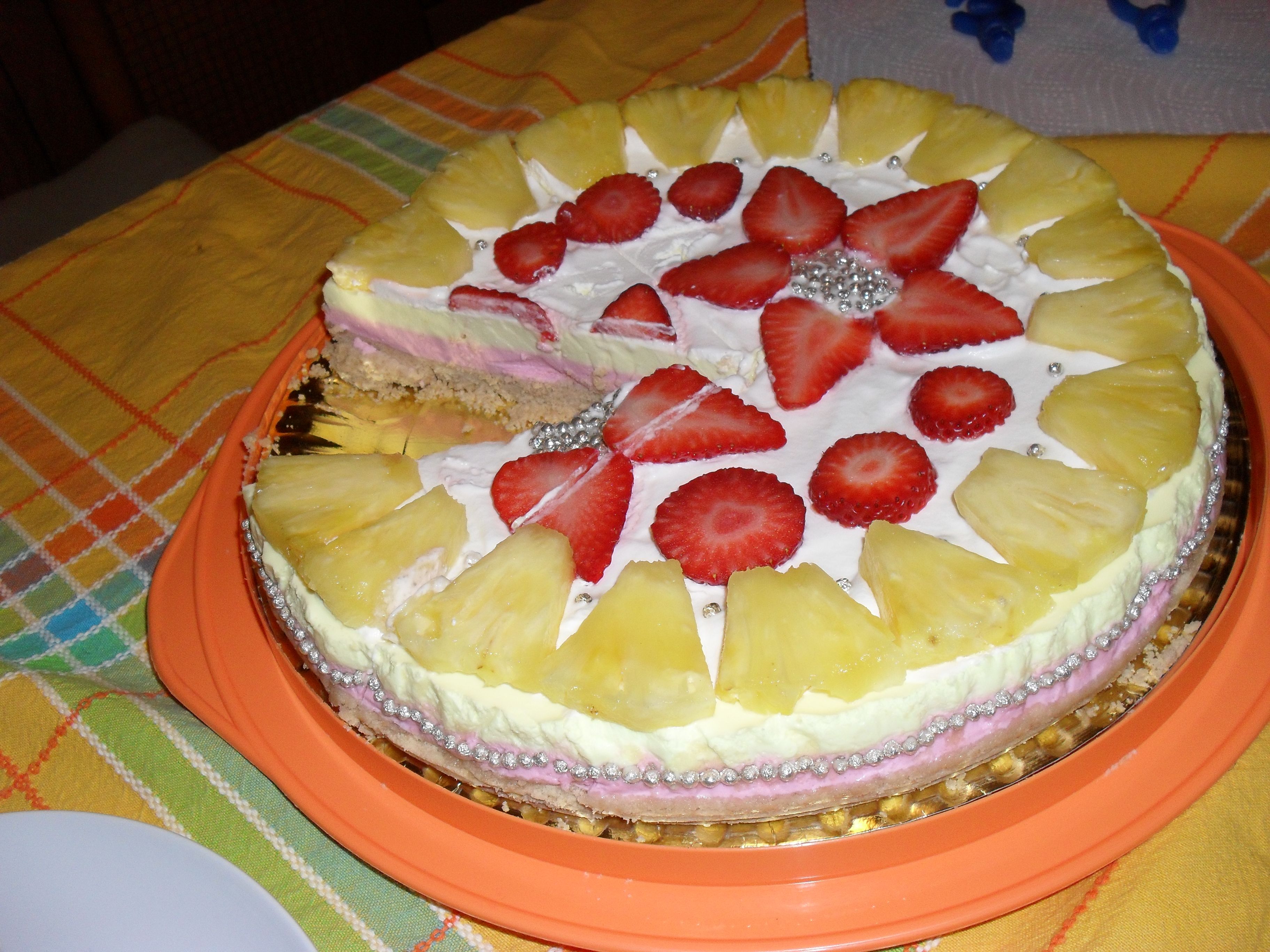 Rivestire con carta forno uno stampo a cerniera. Preparare la base: tritare i biscotti fino a ridurli in polvere, unire il burro fuso, mescolare e coprire con questo composto il fondo della tortiera. Porre in frigo per almeno mezz'ora. Mettere a bagno in acqua fredda i fogli di colla di pesce in 2 bicchieri separati, 4 per ognuno. Preparare la farcia: Montare la panna con lo zucchero a velo, la vanillina e dividerla in 2 parti uguali: in una parte aggiungere lo yogurt alla fragola, un po' di colorante rosso ed amalgamare il tutto bene; nell'altra parte aggiungere invece lo yogurt all'ananas, un po' di colorante giallo ed amalgamare bene. Sciogliere i fogli di gelatina separatamente in un cucchiaio d'acqua dopo averli strizzati ed aggiungere ai composti e mescolare. Ora versare il composto alla fragola sulla base di biscotti e livellare bene. Sopra versare il composto all'ananas e livellare. Porre a solidificare in frigo per qualche ora. Una volta solidificato decorare a piacere la superficie con la frutta e i confettini argentati. Porre in frigo