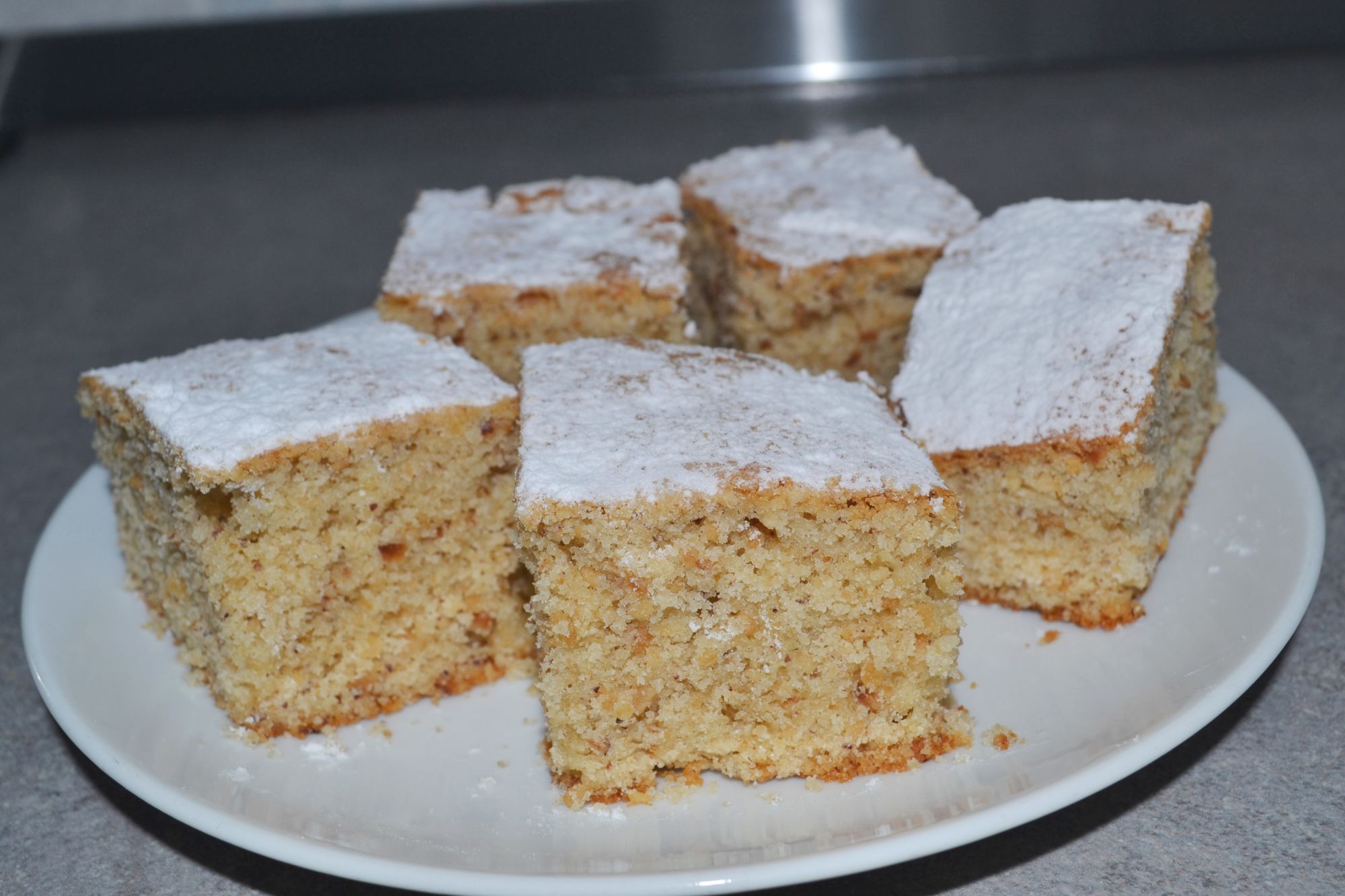 Tritare le nocciole tostate. Sbattere le uova con lo zucchero, aggiungere il burro fuso, il latte, la farina e le nocciole. Mescolare bene e versare in una teglia coperta da carta da forno.