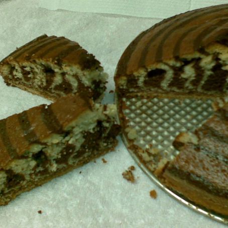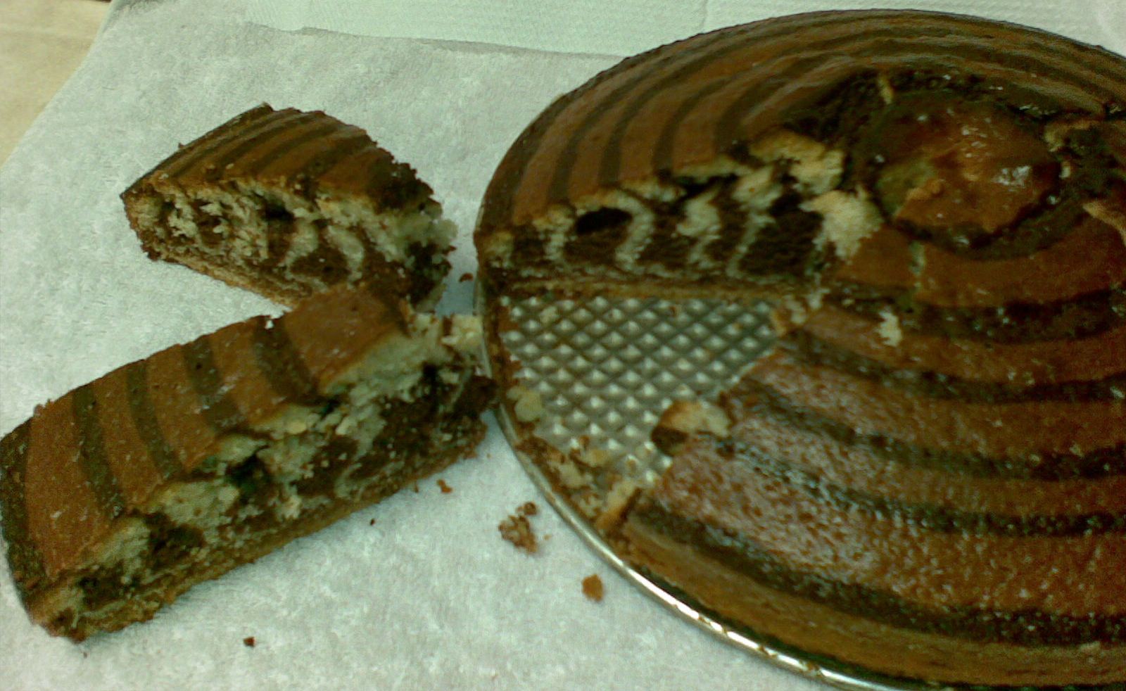 Imburrare e infarinare la teglia e, con un cucchiaio, versarvi in modo alternato il composto: mettere due cucchiaiate dell'impasto bianco nel centro della teglia e sovrapporvi due cucchiaiate di quello al cacao senza spalmarlo ma lasciando che si spanda da solo; proseguire nuovamente con l'impasto bianco, poi quello al cacao e così via fino al termine degli ingredienti.