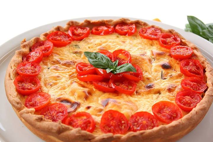 Lasciare intiepidire la torta, sformarla sul piatto di portata, decorare con i pomodorini e un ciuffetto di basilico.