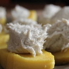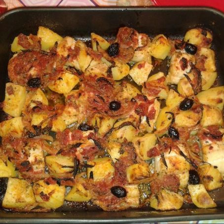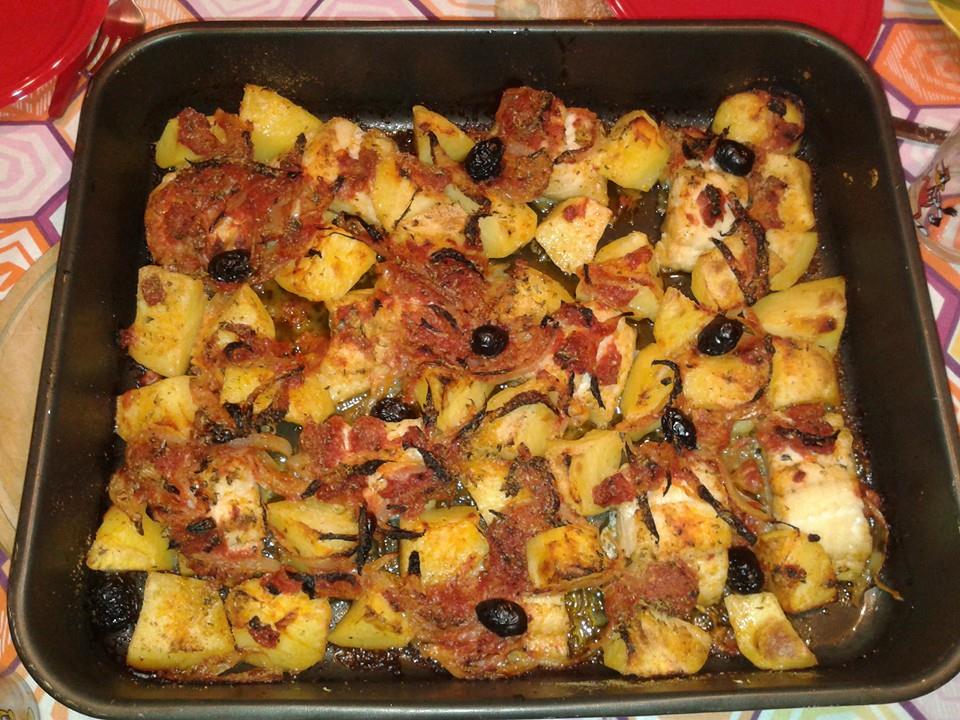 Prendere una bella teglia grande,mettere i filetti di baccalà,le patate bollite tagliate a tocchetti,cospargere con la salsa di pelati e cipolle,pepare e salare pochissimo(il baccalà è già salato).