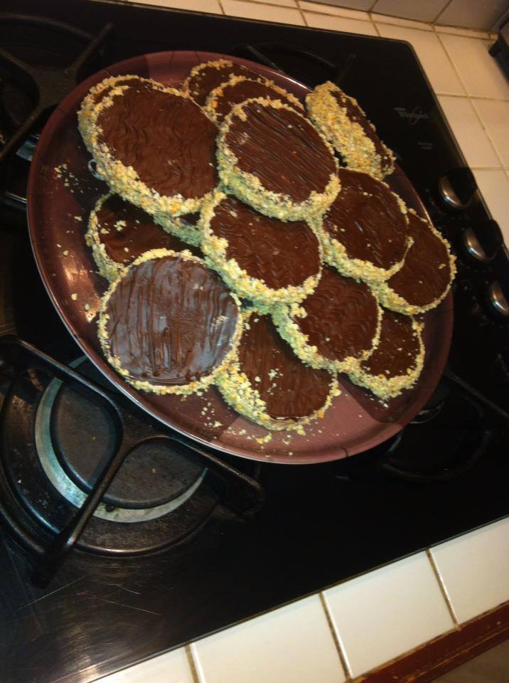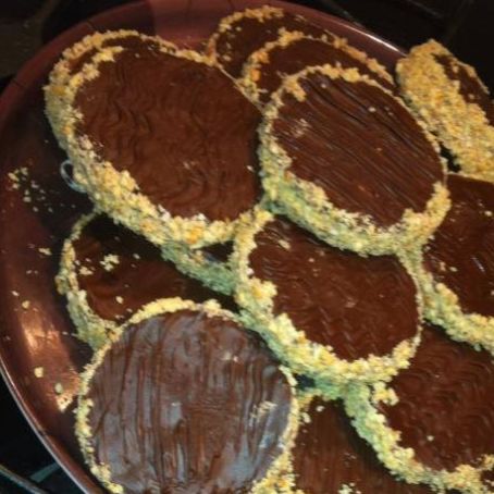 Prendere i dischetto ormai cotti. Posizionare al centro la crema, chiudere con un altro dichetto e decorare i bordi con gli arachidi tostati e tritati.